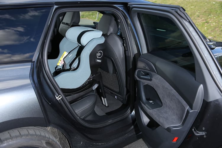 La réponse est (fort heureusement) oui ! Le break (appelons un chat, un chat) accueille aisément une famille et ses bagages, à condition de ne pas vouloir emporter toute la maison. Fixations ISOFIX à l’avant et à l’arrière, banquette spacieuse, climatisation indépendante : l’habitacle est pensé pour le confort des passagers. Les accroches i-Size sont très facilement accessibles derrière des caches en plastique pivotants. Une fois en place, notre siège complet (base Thule Alfi et siège Elm) n’implique pas d’avancer le siège avant, qui peut rester au même niveau que le siège d’un conducteur de 1,80 m. Seuls bémols : le faible angle d’ouverture de la porte pour installer un enfant, l’impossibilité de caser les pieds sous le siège avant, une assise centrale peu accueillante, un plancher surélevé qui implique de remonter les genoux et des petits bacs de portes. Mais on se console avec le plancher presque plat, des sièges chauffants (inclus dans le pack hiver à 910 €) et un toit vitré qui filtre bien les rayons du soleil, même si son aspect laiteux en mode ouvert gâche un peu la vue vers la cime des montagnes.