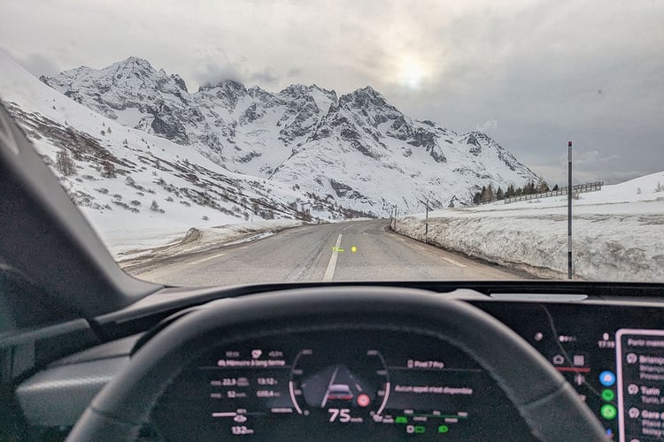 Si l’ascension du technique col de Montgenèvre depuis Briaçon ne figure pas parmi ses terrains de jeu favoris, l’A6 Avant e-tron enchaîne avec aisance les courbes rapides du col du Lautaret. Un tracé qui convient parfaitement à son tempérament. Son poids de 2 185 kg ne se fait réellement sentir que lors des changements de cap les plus marqués, finalement rares sur ce tracé, tandis que les 367 ch et 585 Nm de couple (jusqu’à 380 ch avec l’Overboost) que peut délivrer la machine électrique arrière sont suffisants : comptez 1,0 s pour le 50-70 km/h, 2,0 s pour le 30-70 km/h et, sur autoroute, 3,5 s pour le traditionnel 80-120 km/h.