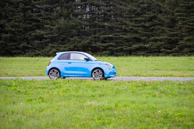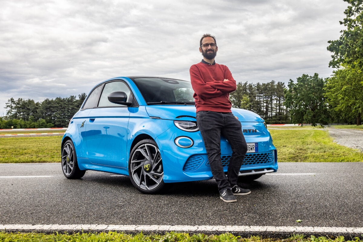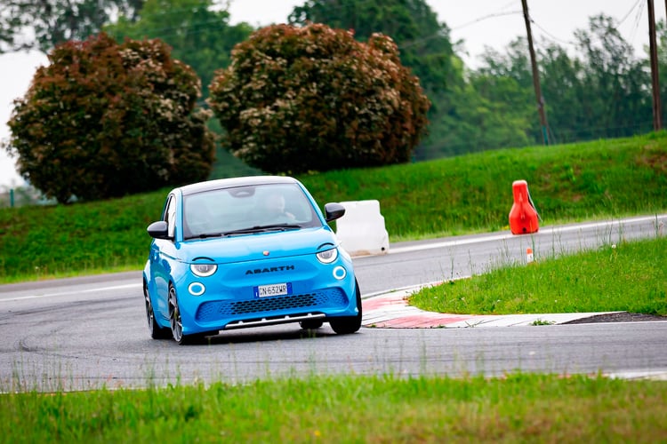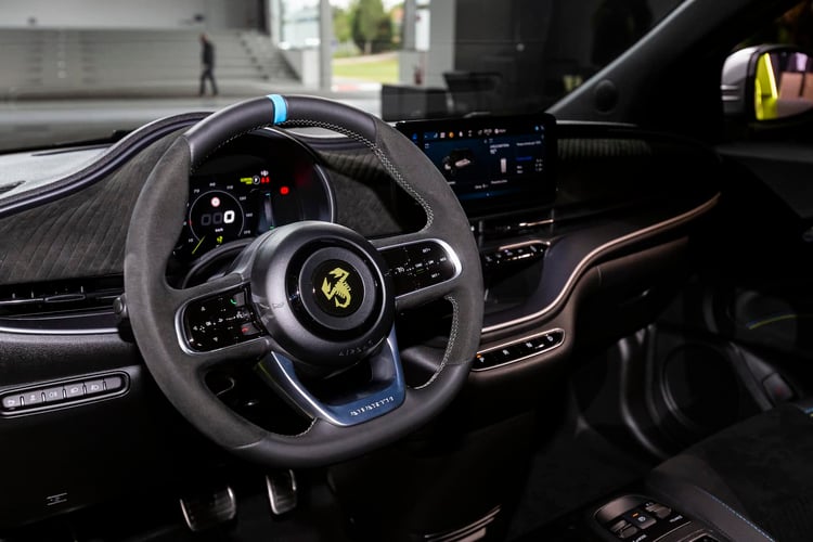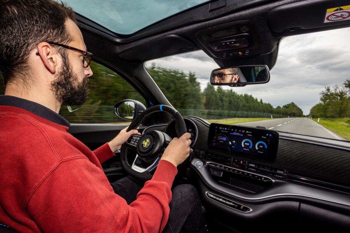 Nous voici installés au volant. Par rapport aux Abarth 595 et 695 thermiques, la position de conduite a nettement progressé : nous n’avons plus ici la sensation de conduire assis sur un tabouret. Merci à la nouvelle plateforme, remplaçant la thermique conçue pour la Panda II à l’époque où la civilisation occidentale redoutait le bogue de l’an 2000. D’autant que les sièges typés sport offrent un bon maintien.