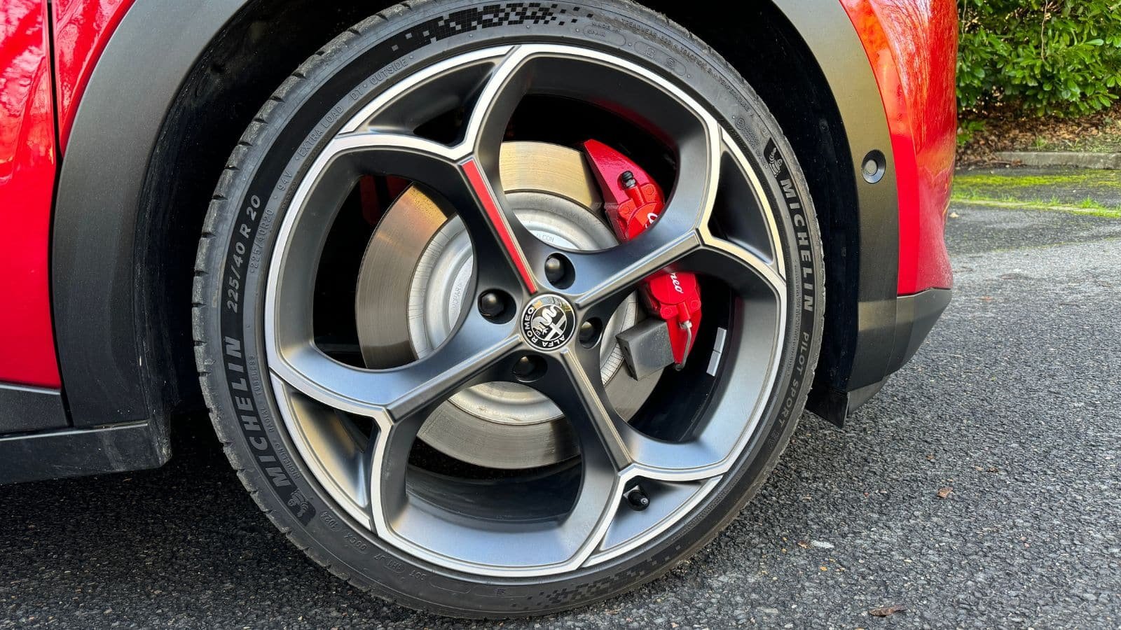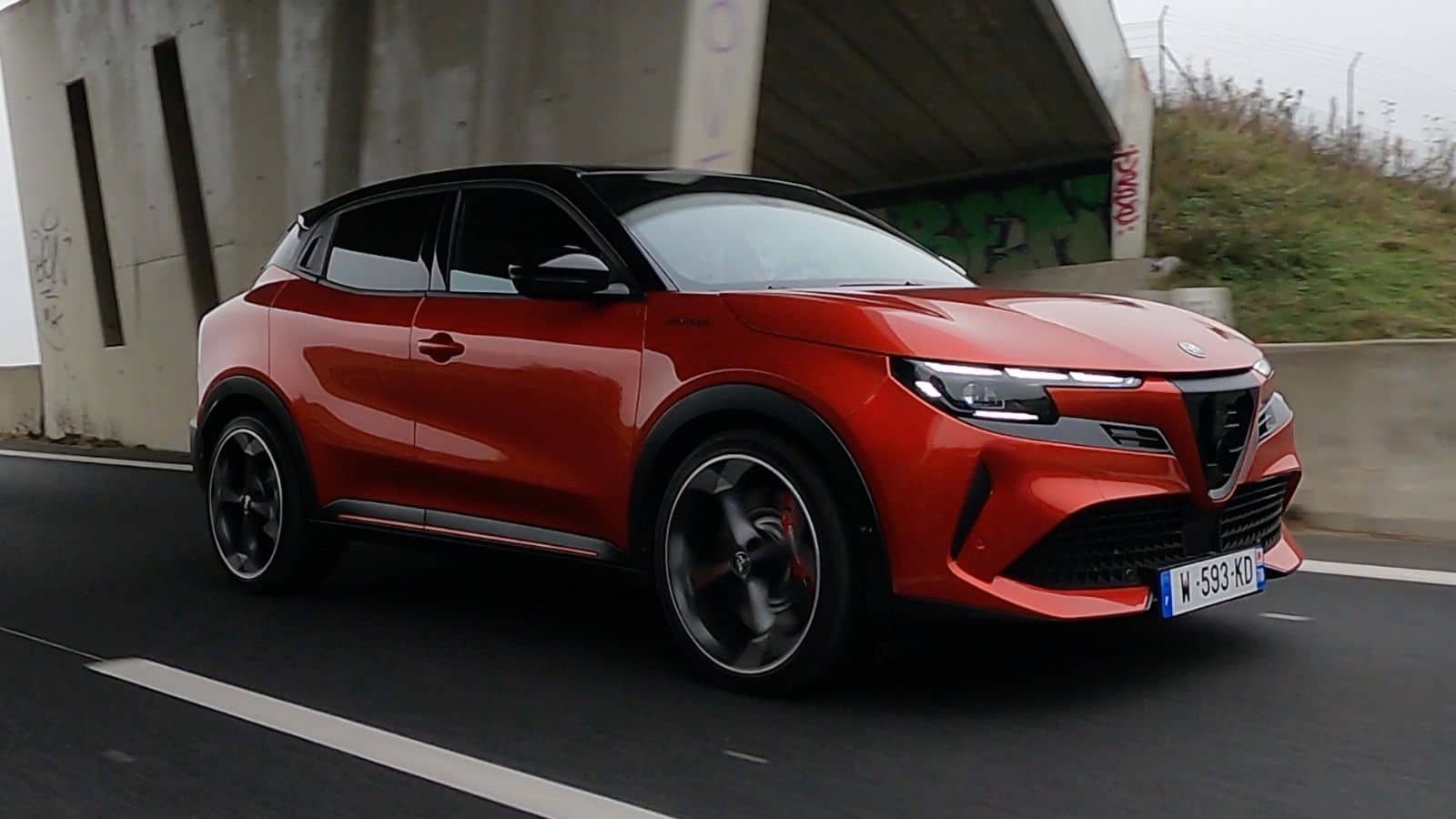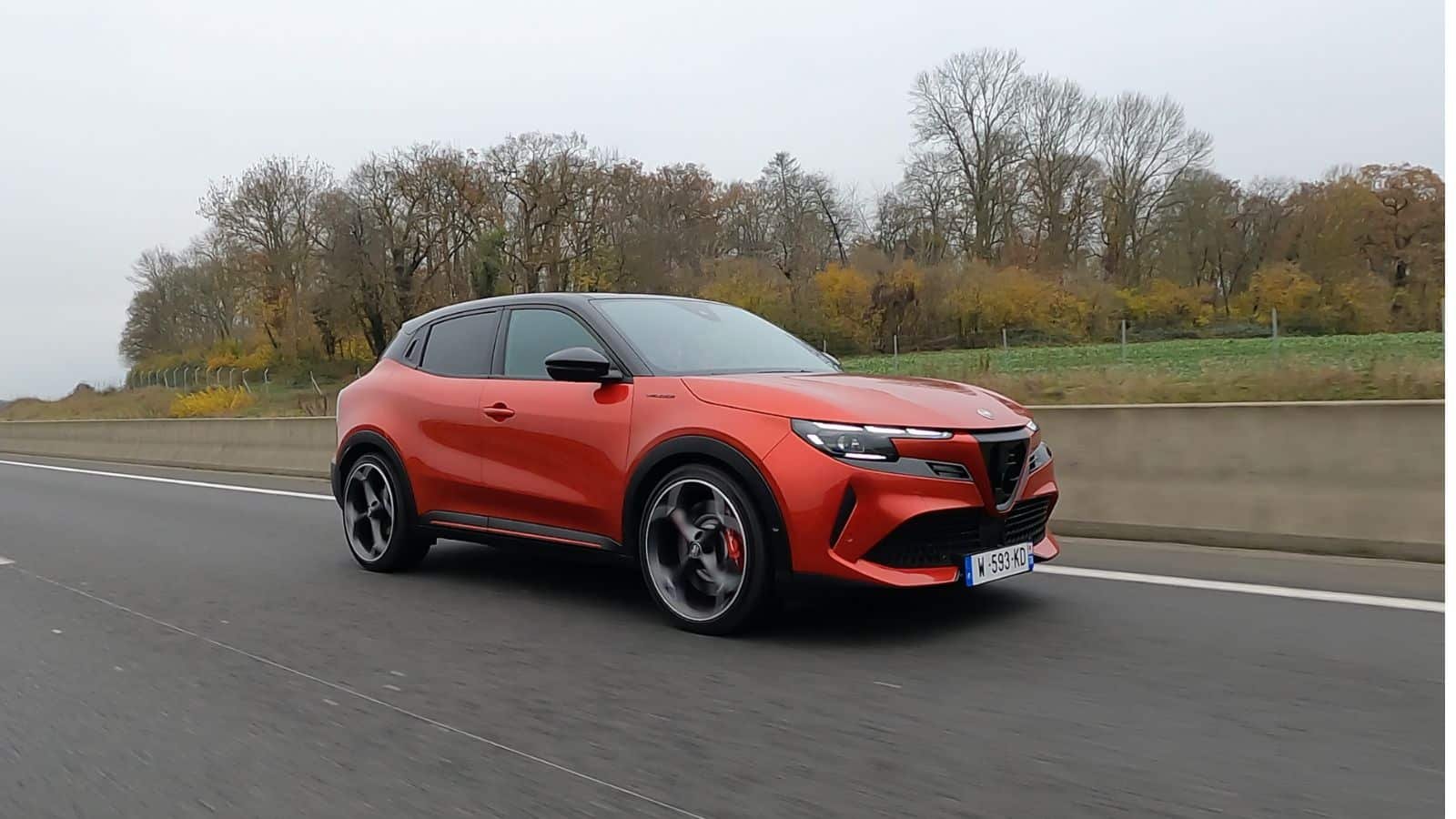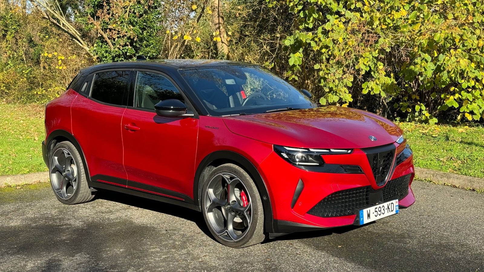 La garde au sol abaissée de 25 mm accentue cette posture dynamique, tout comme les grandes jantes qui remplissent parfaitement les passages de roues. Le design se veut plus musclé et plus travaillé que celui des Peugeot e-2008 et Opel Mokka, avec une personnalité résolument Alfa Romeo. Les détails, comme les étriers de frein Brembo peints en rouge et les vitres arrière surteintées, viennent peaufiner une esthétique soignée.