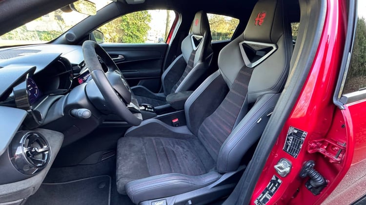 L’accélération de 0 à 100 km/h en 5,9 secondes illustre parfaitement le tempérament sportif de ce Junior Veloce. La direction, calibrée avec un ratio de 14,6, se montre précise et réactive, offrant une connexion directe avec la route. Grâce au différentiel Torsen et aux suspensions rigides, le train avant affiche une motricité et une agilité remarquables, même à haute vitesse. Il faut cependant bien garder les deux mains sur le volant, soumis à des effets de couples, pour exploiter toute la fougue de ce train avant chirurgical. L’Alfa Junior Veloce nécessite l’implication de son conducteur comme une Alfa 156 GTA. Les pneus Michelin EV Sport garantissent une adhérence optimale, tandis que le freinage Brembo, avec ses disques de 380 mm, inspire une grande confiance et un dosage parfait en mode normal comme avec le mode B qui accentue le freinage régénératif. En mode Sport, l’intervention de l’ESP et de l’antipatinage est retardée, permettant au conducteur d’exploiter pleinement les capacités du châssis. Les mouvements de caisse sont parfaitement contenus, avec un roulis quasi inexistant, et l’amortissement encaisse beaucoup mieux les chocs à partir de 80 km/h.
