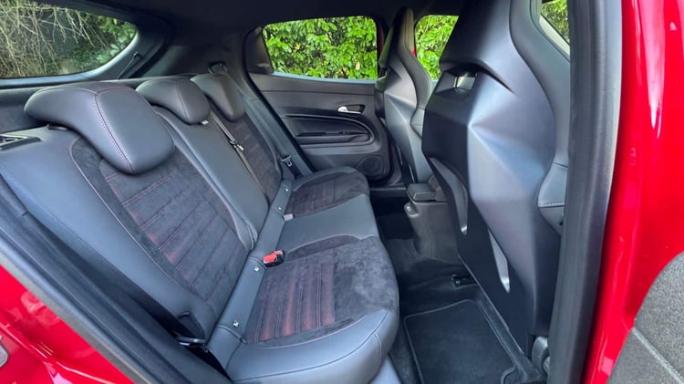 À l’avant, les sièges baquets Sabelt en Alcantara, inclus dans le Pack Sport, offrent un maintien exceptionnel mais sont trop serrés au niveau des hanches pour les gabarits plus imposants. Les matériaux utilisés dans l’habitacle, bien que globalement esthétiques, souffrent de la présence de plastiques durs. Heureusement, des détails comme le tunnel central rembourré, pour bien caler son genou, apportent une touche de confort bienvenue.