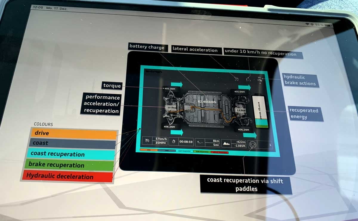 Durant notre ascension et notre descente, les équipes d’Audi nous ont confié une tablette. Equipée d’une application directement reliée à la voiture, celle-ci permettait de suivre le niveau de récupération d’énergie, la répartition du couple entre les quatre roues ou la puissance instantanée des deux moteurs.