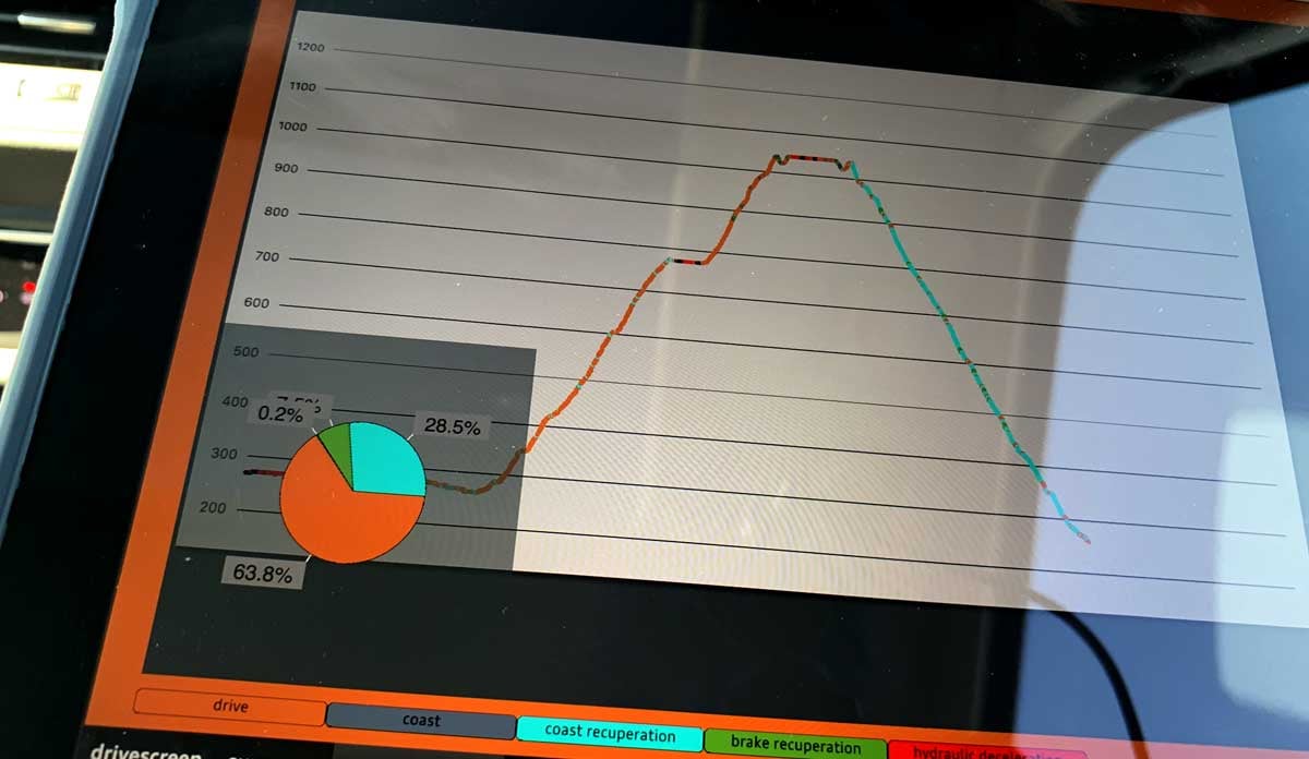 Outre l’ascension, l’objectif d’Audi était surtout de nous démontrer les capacités de son dispositif de régénération. A l’usage, deux choix possibles : soit laisser le système en mode « automatique », cas dans lequel le frein moteur est directement géré par le système en fonction de la topographie et du système GPS. Seconde option : opter pour le mode « manuel » avec un dispositif de palettes intégré derrière le volant qui permet de doser l’intensité avec trois niveaux de récupération.