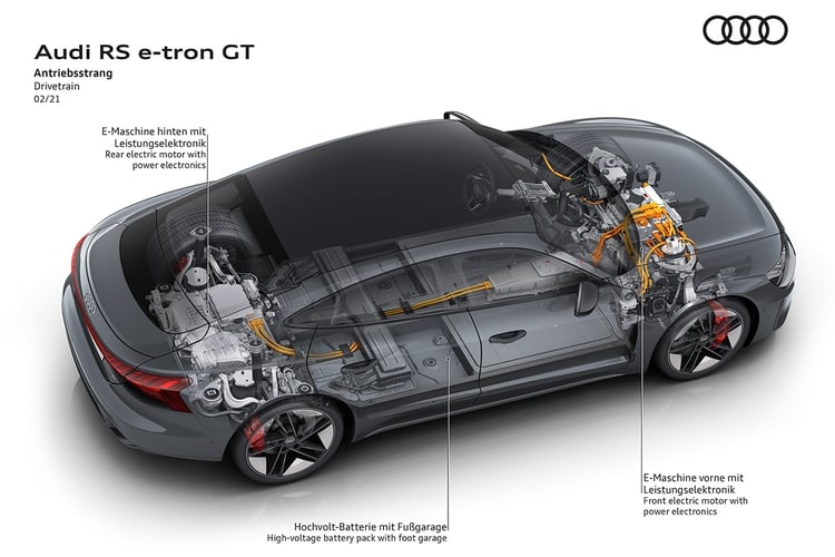 L’e-Tron GT embarque une batterie de 93,4 kWh, dont 83,7 kWh de capacité utile. Les 396 cellules poches sont fournies par LG Chem (modèle E66a) et réparties en 33 modules. Le principe de raccordement 198s2p permet à cette unité de 630 kg de fonctionner sous une tension 800 V, ou plus précisément sous une tension nominale de 724 V. Comme la Taycan, elle a été la première à disposer d’une telle tension de fonctionnement. Un coup d’avance qu’elles doivent à l’entreprise croate Rimac, avec laquelle le groupe allemand a noué un partenariat.