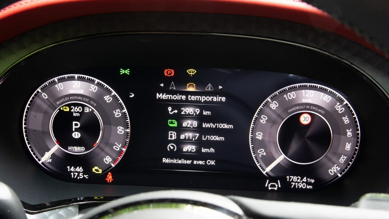 Une fois sorti de Paris, il devient impossible de résister à l’envie de réveiller le V8, ce vieil ami déjà vu sur les Porsche Panamera, Lamborghini Urus et autres Audi RS6. Détail qui a son importance, Bentley a augmenté la pression d’injection, la faisant passer de 200 à 350 bars et s’est débarrassé de la désactivation partielle des cylindres. Une pression sur le mode Sport va transformer cette paisible électrique douce comme un petit chaton en lion prêt à rugir. La bande son change instantanément et fera dresser les poils au plus blasé des journalistes auto. Non seulement la poussée est plus franche qu’un commentaire de votre belle-mère sur l’éducation de vos enfants, mais dans ce cas aussi, celle-ci semble ne jamais vouloir s’arrêter. Pour les esprits chagrins qui regrettent le W12, sachez qu’on passe de 659 à 782 ch, de 900 à 1000 Nm et de 3,5 s à 3,2 s pour expédier le 0 à 100 km/h. La vitesse de pointe annoncée à 335 km/h devrait finir de convaincre les réfractaires à l’hybridation.