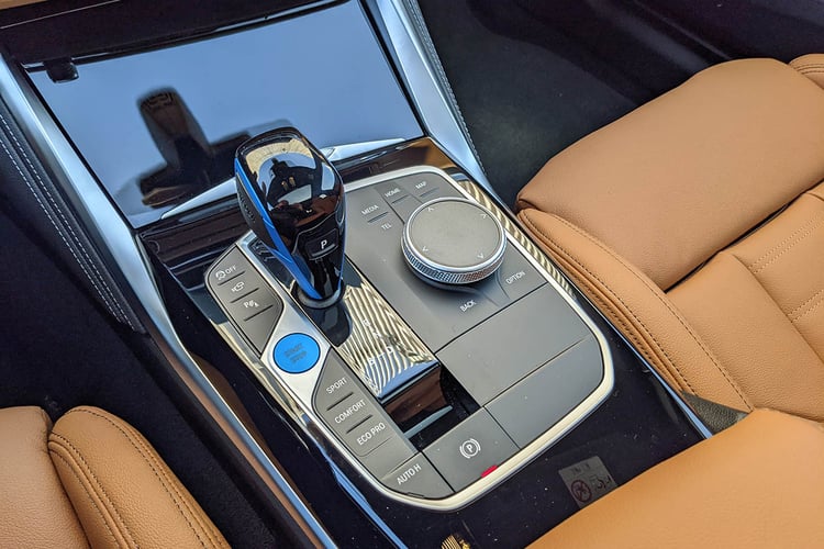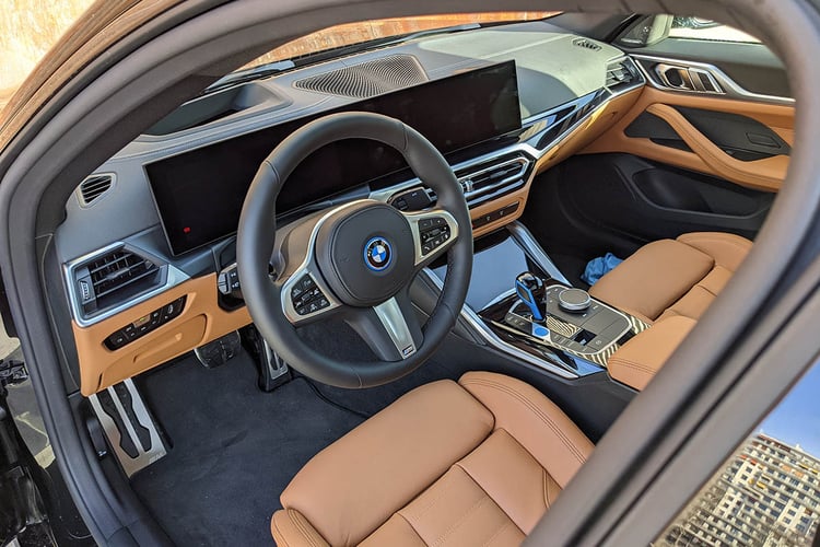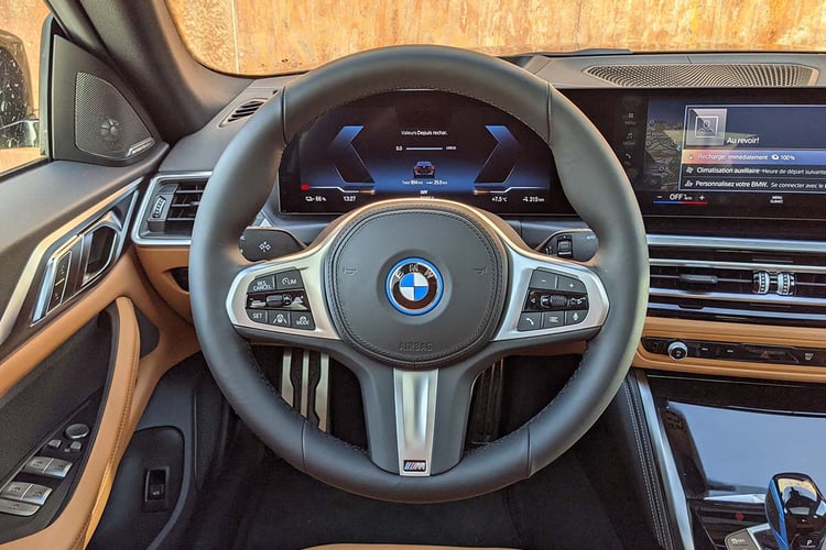 À l’intérieur, la BMW i4 eDrive40 partage les mêmes attributs que la M50. Surtout dans cette version M Sport, aussi équipée du kit carrosserie et des Michelin Pilot Sport 4. L’habitacle tiré à quatre épingles ne souffre d’aucune critique là aussi, avec une énorme dalle devant le conducteur, légèrement incurvée et composée d’une instrumentation de 12,3 pouces et d’un infodivertissement de 14,9 pouces. L’ensemble est secondé par un affichage tête-haute convaincant. La présentation est correcte, mais l’ergonomie n’est pas toujours optimale dans ce florilège de menus.