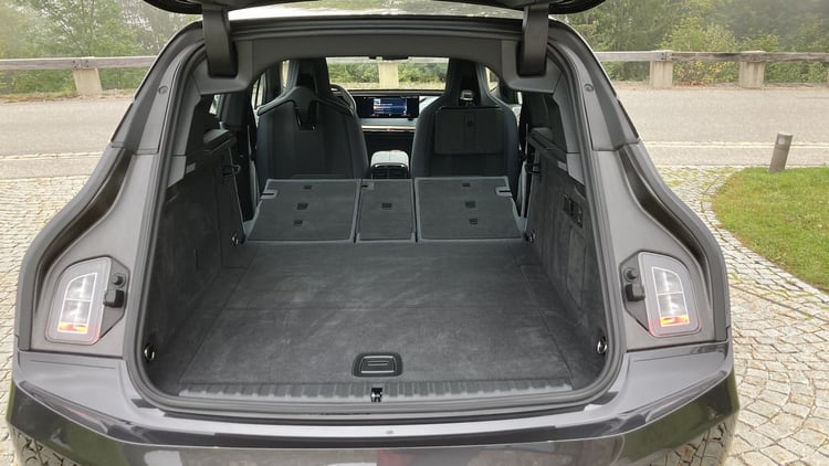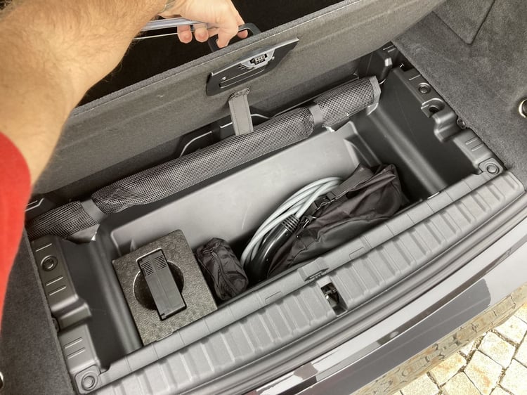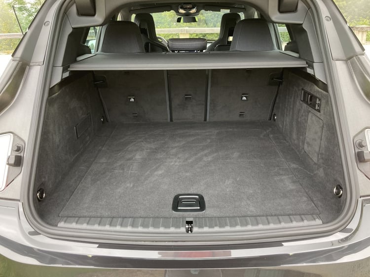 Pour son gabarit, le BMW iX n’offre pas un coffre exceptionnel. Derrière le hayon activé électriquement, le volume sous tablette et au-dessus du double fond est de 500 litres. Un bouton accessible de l’arrière du véhicule permet de rabattre d’un coup le dossier en 3 parties. La plateforme ainsi obtenue est quasiment plate.