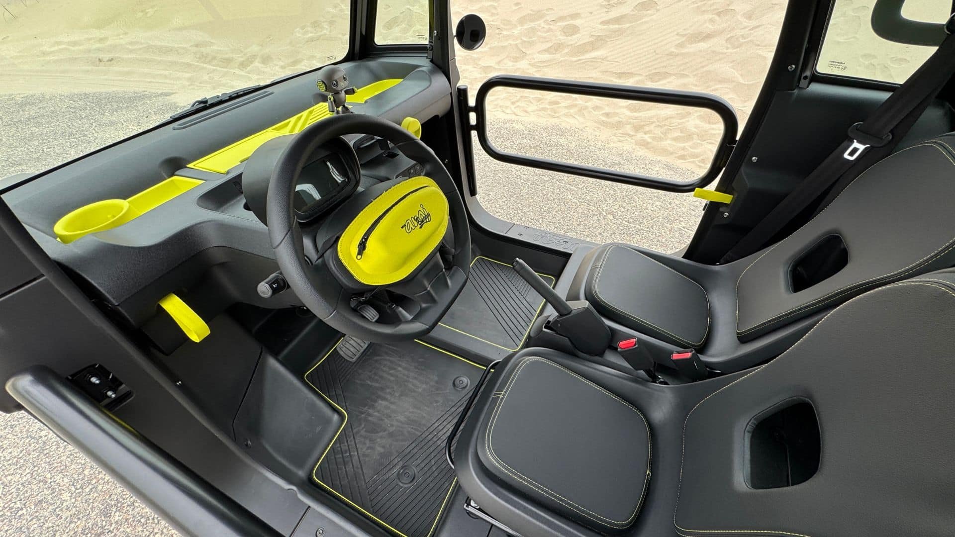 La Citroën Ami Buggy ne fait pas dans la demi-mesure : pas de portières, mais des barres de renfort façon escalade urbaine et un toit ouvrant en toile pour profiter des rayons du soleil ou… de la pluie si vous oubliez de le refermer. Pas de clim’ ni même de ventilation, mais un petit personnage magnétique posé sur la planche de bord en guise de copilote. Minimaliste, mais attachant. La finition « Palmeira » ajoute un peu de peps avec un pack Color jaune à 400 €, comprenant des stickers décoratifs, des rangements supplémentaires sur la planche de bord et une petite trousse amovible sur le volant. De quoi personnaliser son Ami sans se ruiner.