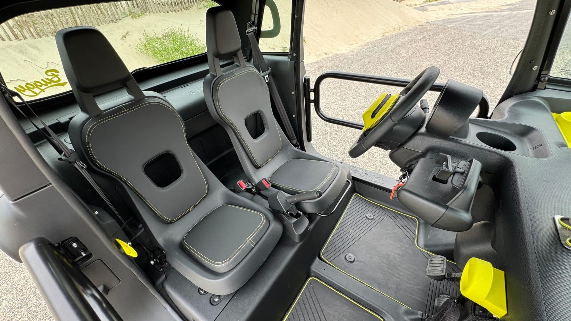 Malgré sa simplicité, le confort de suspension reste tout à fait correct. La sellerie est basique et ferme, mais l’amortissement absorbe plutôt bien les imperfections de la route. Le freinage est rassurant grâce à un disque à l’avant et un poids plume de 470 kg pour cette version Buggy (contre 483 kg pour la version classique). Moins de bruit, plus de rigidité, pas d’effet caisse de résonance : cette Buggy gagne en agrément. Se balader décapoté au Touquet à son volant, c’est une expérience unique, presque décalée. Et, si l’envie vous prend de tirer le frein à main dans une allée sablonneuse… eh bien, la stabilité est au rendez-vous (mais on ne vous a rien dit). En hiver, mieux vaut bien se couvrir et investir dans les bâches transparentes latérales proposées à 400 €.