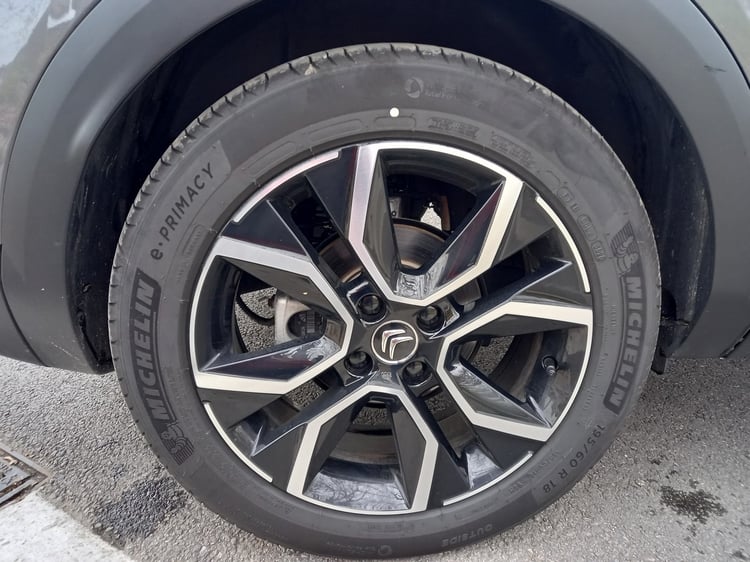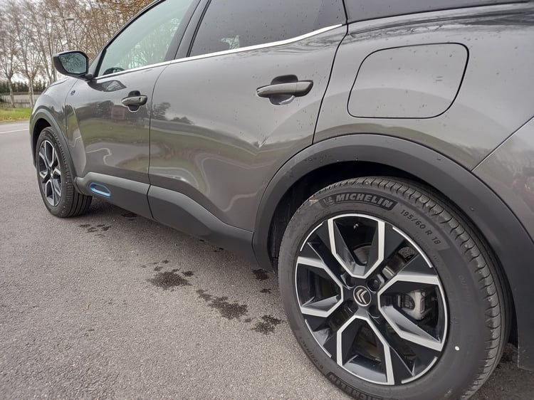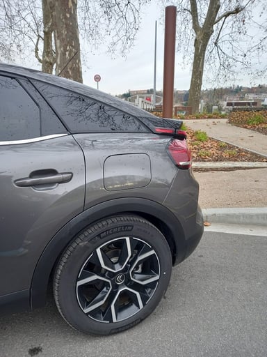 Les jantes de 18 pouces sur lesquelles repose la Citroën ë-C4 sont également de bonne facture. Leur design avec quatre formes géométriques est mis en valeur par la couleur argentée sur fond noir.