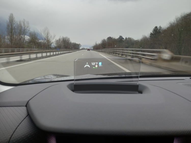 Cet écran, un peu petit en taille, se manipule entièrement via le volant et les commodos. Cela permet de ne pas quitter la route des yeux. Et pour aider à encore plus de vigilance, on retrouve un affichage tête haute très bien fait. Il nous propose en effet la vitesse du véhicule, celle du régulateur, et affiche les indications du GPS.
