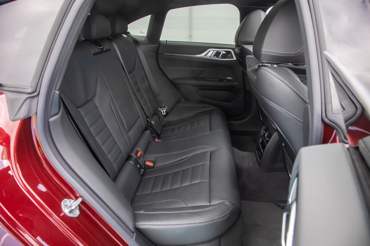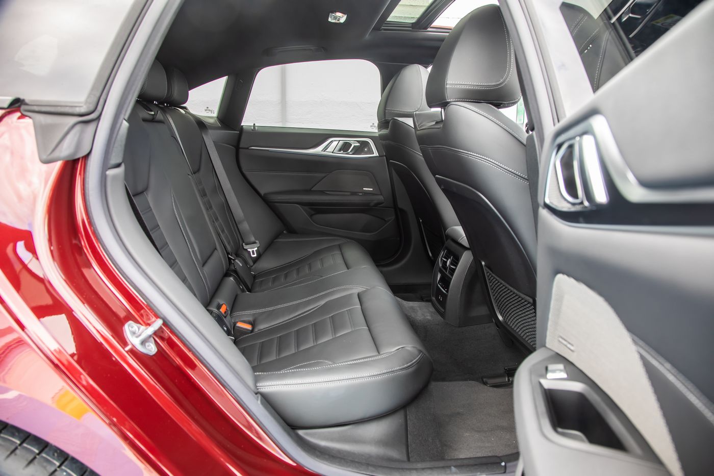 Un empattement un peu moins long de presque 2 cm (2,856 contre 2,875 m) n’empêche pas la BMW i4 de bien traiter ses 2 principaux passagers à l’arrière au niveau de la place aux jambes. La finition est soignée, 2 prises USB-C sont accessibles et les rangements sont nombreux. En revanche, la banquette est ferme, le tunnel central de service n’aide pas à accueillir un troisième occupant, et la garde au toit limitée ne satisfera pas les personnes de plus de 1,80 m.