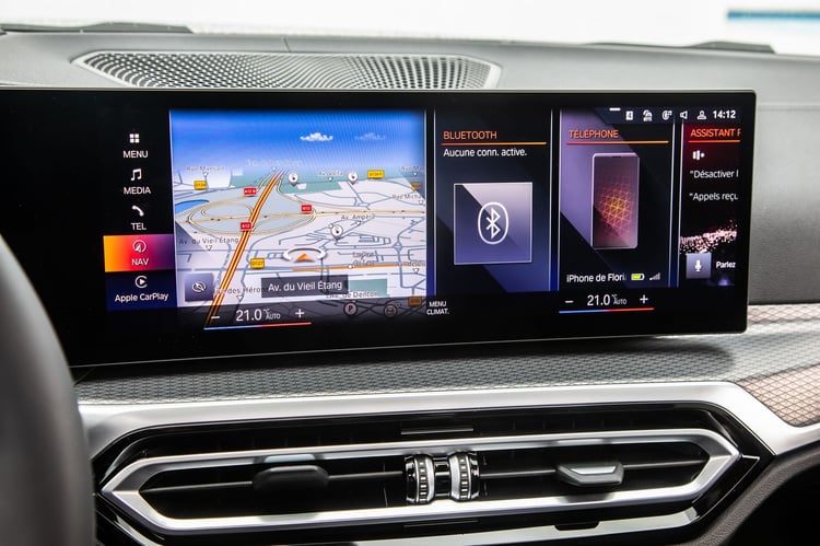 À l’avant de la BMW i4, le conducteur sera forcément séduit par une présentation impeccable made in Germany. Joints, assemblage des matériaux, et repose-genoux moussés contribuent pour beaucoup à cette forte impression.