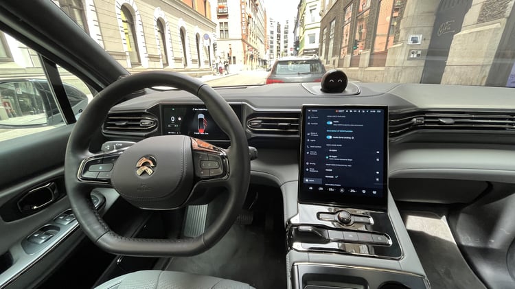 Non, non, Maxime, même pas en rêve : c’est le SUV ES8 qui t’attend dans une rue adjacente ! Lui, et Nomi, ton compagnon de voyage installé au milieu du tableau de bord pour veiller à ce que tout se passe bien pendant ton essai. La bouille du véhicule semblerait presque avoir été obtenue d’un mélange entre deux autres voitures chinoises : les MG Marvel R et Aiways U5.