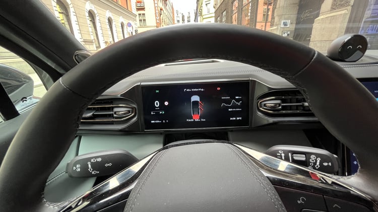 Tous les systèmes peuvent aussi être configurés avec la tablette implantée en mode portrait. Y compris les flux d’air dans l’habitacle, à la manière des Tesla. Elle se montre très réactive. Afin de ne pas laisser des traces de doigt sur l’écran, une molette et des boutons permettent de naviguer dans les menus et de valider les modifications.