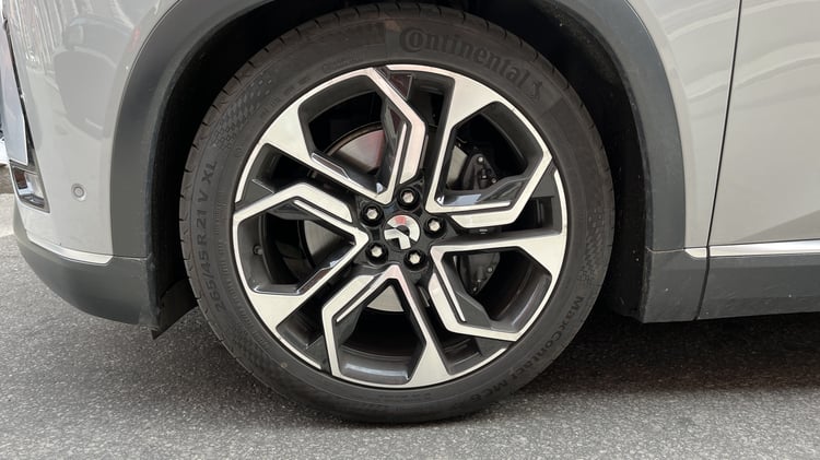 En tournant autour de l’ES8, on remarque rapidement l’abondance de caméras et de radars : sous le capot, face à la route au niveau du rétroviseur intérieur, dans ceux à l’extérieur, tout en bas du bouclier arrière, etc. Le modèle essayé s’appuie sur des suspensions pneumatiques qui permettent en particulier d’abaisser la hauteur de caisse pour faciliter l’accès à bord, et des jantes alliage 21 pouces chaussées de pneus Continental en 265/45.