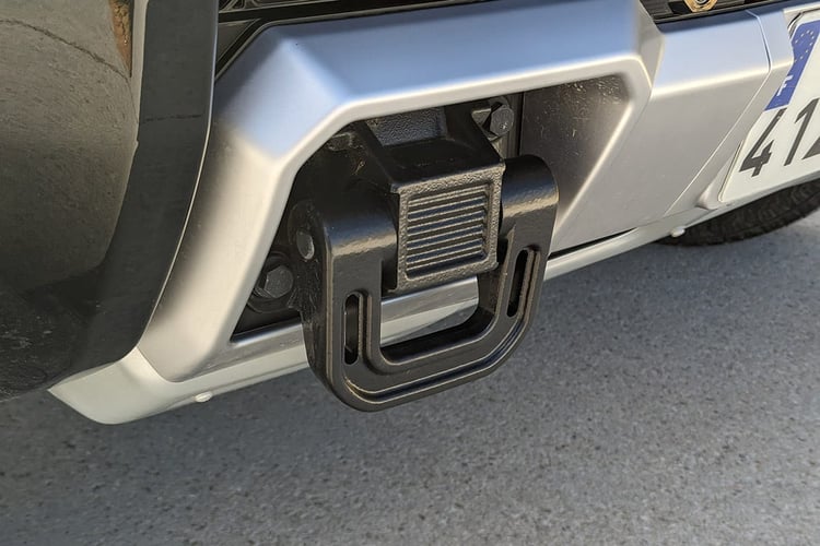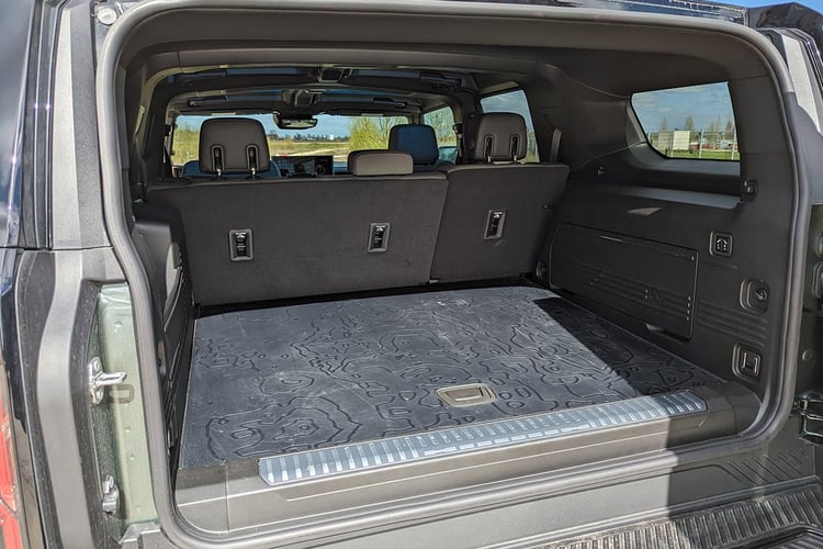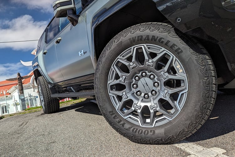 Pourtant, sur le papier en tout cas, les dimensions n’ont rien d’exotique dans un paysage automobile qui gonfle à vue d’oeil. Avec une longueur de 5,23 m (le pickup grimpe à 5,50 m) pour 2,18 m de large, il occupe autant de place au sol qu’un Tesla Model X. La hauteur de 1,98 m, surtout handicapante pour le conducteur, ne limitera pas plus la polyvalence qu’avec un Volkswagen ID.Buzz : comme avec ce dernier, il faudra viser la bonne file au péage et éviter les parkings souterrains. Au final, ce sont bien les roues qui impressionnent le plus, notamment avec les jantes de 22 pouces chaussées de pneus Goodyear Wrangler Territory (référence peu anodine) de 305/55 aux quatre coins.