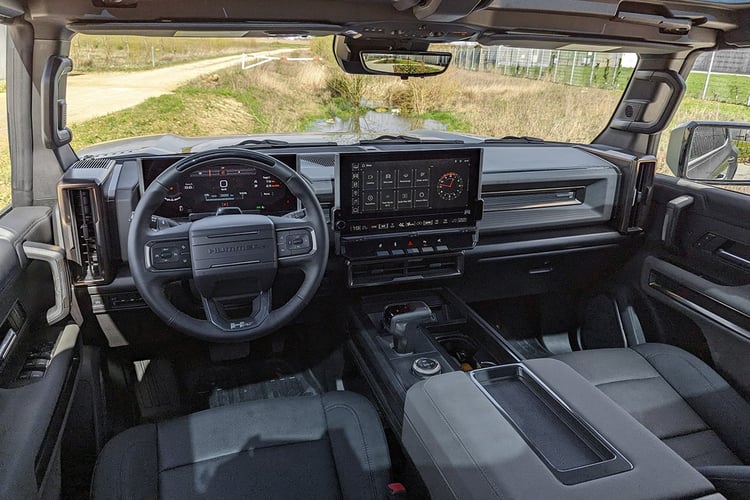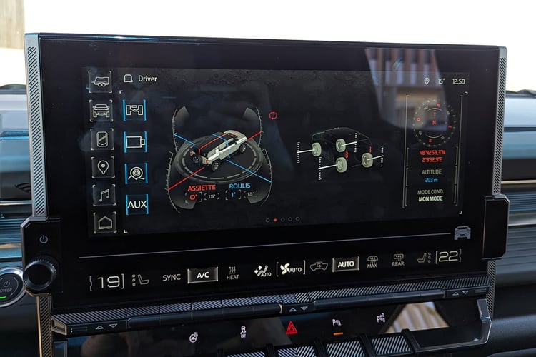 A bord, on retrouve l’univers Hummer, avec une imposante console centrale entre les passagers. En revanche, l’ambiance est forcément plus technologique qu’auparavant, avec la présence d’une instrumentation numérique de 12,3 pouces et un écran tactile central de 13,4 pouces. Mais contrairement à de nombreux constructeurs qui veulent mimer la présentation Tesla, Hummer a fait un choix bien à part et cultive sa culture. Les menus et animations s’apparentent à ce que l’on peut retrouver sur certains jeux vidéos militaires. Preuve en est avec la sélection des modes de conduite ou un Hummer SUV semble vouloir tout écraser sur son passage en fonction du mode sélectionné, ou le champ lexical du mode WtF (pour Watt to Freedom) qui, après une courte procédure de préparation, signale son activation par un expressif « armé » au tableau de bord.