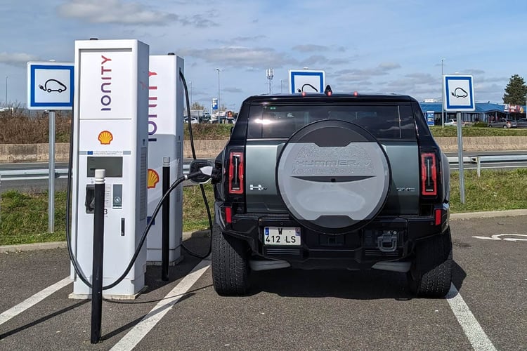 Hélas, nous n’avons pas eu tout le loisir de vider la batterie pour vérifier ses performance en matière de recharge rapide. Sur le papier, le SUV peut atteindre un pic de 300 kW et catapulter le 10-80 % en une trentaine de minutes. De notre côté, même en étant branché dès 52 % de charge, le véhicule a pu atteindre un pic fugace de 240 kW. Au final, nous avons pu récupérer 54 kWh en 34 minutes malgré une recharge absolument pas optimisée. A noter qu’il est necessaire de disposer d’un adaptateur pour pouvoir recharger le Hummer sur les bornes Européennes, puisque ce dernier est équipé d’un port CCS1.