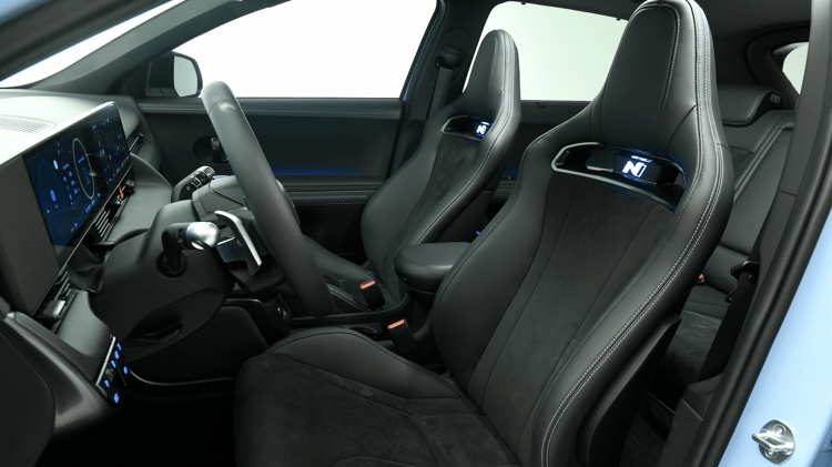 Le siège baquet en alcantara flatte le toucher, mais ne retient pas assez le conducteur ou la conductrice au niveau des entrecôtes. Heureusement, la position est rajustée vers le bas de 2 cm par rapport à la Ioniq 5 classique. Autre astuce : on a rajouté une console centrale à la place du vide, permettant d’engoncer davantage le conducteur ou la conductrice. Ceci permet aussi de reposer son genou en virage.
