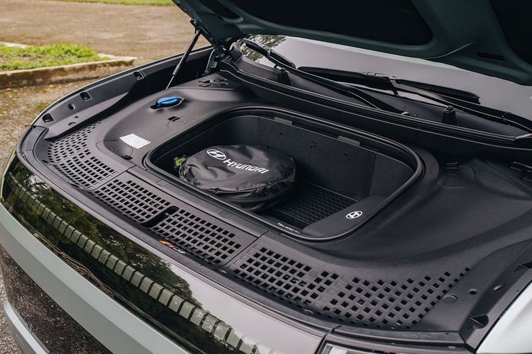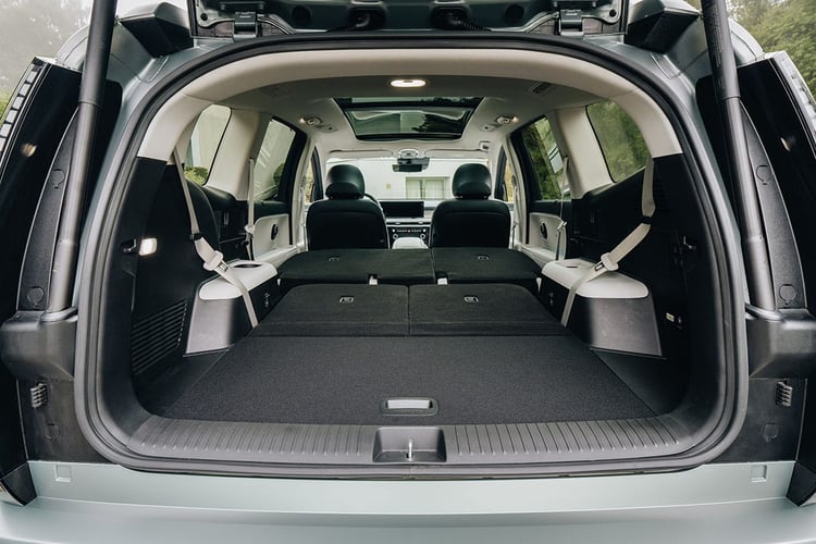 Côté coffre, le Hyundai Ioniq 9 est un vrai utilitaire. En configuration sept places, il propose un volume assez généreux de 338 l. Il est possible d’y loger avec facilité plusieurs affaires. En configuration cinq places, il libère un espace de 908 l. Enfin, lorsque tous les dossiers sont à plat, le volume monte à un maximum de 2 419 l. Toujours au rayon des aspects pratiques, notons la console centrale coulissante sur 19 cm, la boîte à gant centrale ouvrable dans les deux sens, les larges rangements, les nombreux et puissants ports USB et les sièges avec position Zéro Gravity qui sont de véritables invitations à la sieste. Bien sûr, n’oublions pas le rangement sous le très haut capot avant de 88 ou 52 l en fonction de la configuration mécanique.