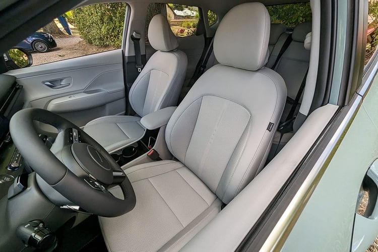 À bord, l’ambiance change radicalement. À l’image du Kia Niro, qui simule l’atmosphère de l’EV6, le Kona puise son inspiration chez les Ioniq de la gamme. Large, lumineux et presque épuré, le poste de conduite ne cède pas au tout tactile. Il se distingue par une grande dalle numérique composée de deux écrans de 12,3 pouces, et d’un panneau central avec tout un lot de commande physique. Ce dernier n’est pas aussi coquet et moderne que la Touch Bar du Niro, mais l’ergonomie est plus simple. Le combiné d’instrumentation conserve les graphismes déjà connus à bord des Hyundai, mais le système d’info-divertissement présente des icônes revues. Pas de quoi changer la vie des habitués cependant.