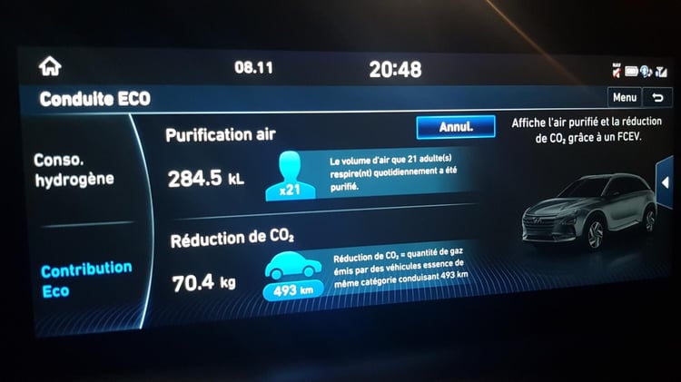 Nous pouvons enfin prendre le chemin du retour vers Paris. Effectué dans les mêmes conditions qu’à l’aller, le parcours se solde par une consommation moyenne légèrement plus élevée en raison d’un trafic moins encombré : 1,3 kg/100 km. Sur ce trajet, le Nexo prétend avoir « purifié » 310.400 litres d’air et « réduit » 69 kg de CO2. La pile à combustible qui génère l’électricité en combinant l’oxygène de l’air à l’hydrogène est en effet équipée d’un filtre. Extrêmement fin, il ne laisserai passer aucune particule d’un diamètre supérieur à 2,5 microns (PM 2,5) selon Hyundai. La marque revendique également le meilleur rendement au monde pour sa pile à combustible : 60%. Un système qui serait capable de tenir « au moins » 10 ans et 160.000 kilomètres.