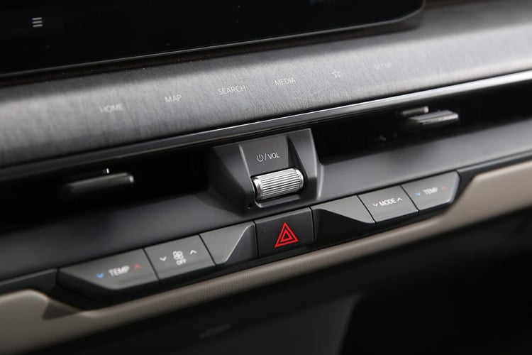 Mais si ses relances sont terriblement muselées, le Kia EV9 fait preuve d’une étonnante agilité sur les routes secondaires. Bien campé sur ses appuis malgré le flanc haut des pneus et doté d’un arrière coopératif, il ne fait qu’une bouchée des routes à virages, avec autant d’aisance qu’un BMW iX, ce qui n’est pas un mince compliment. Et tout ça sans suspensions adaptatives ni même de roues arrière directrices. Ces dernières pourraient toutefois être utiles pour mieux manœuvrer en ville. À noter que l’on retrouve à l’arrière une suspension à réglage automatique d’assiette en cas de transport de charges lourdes.