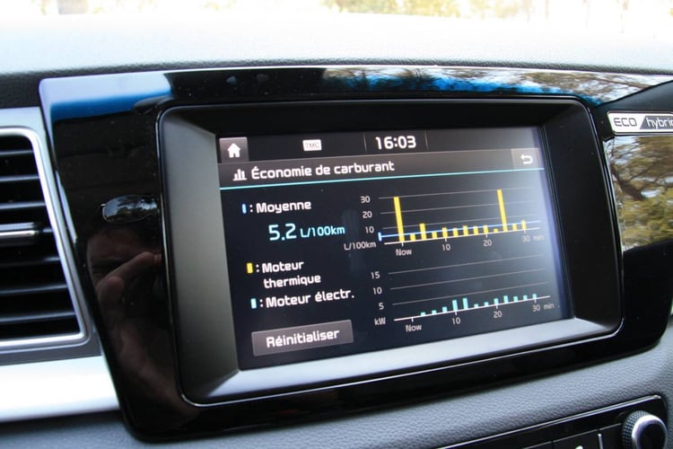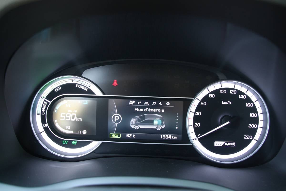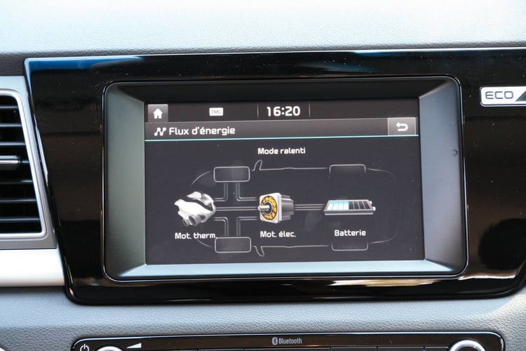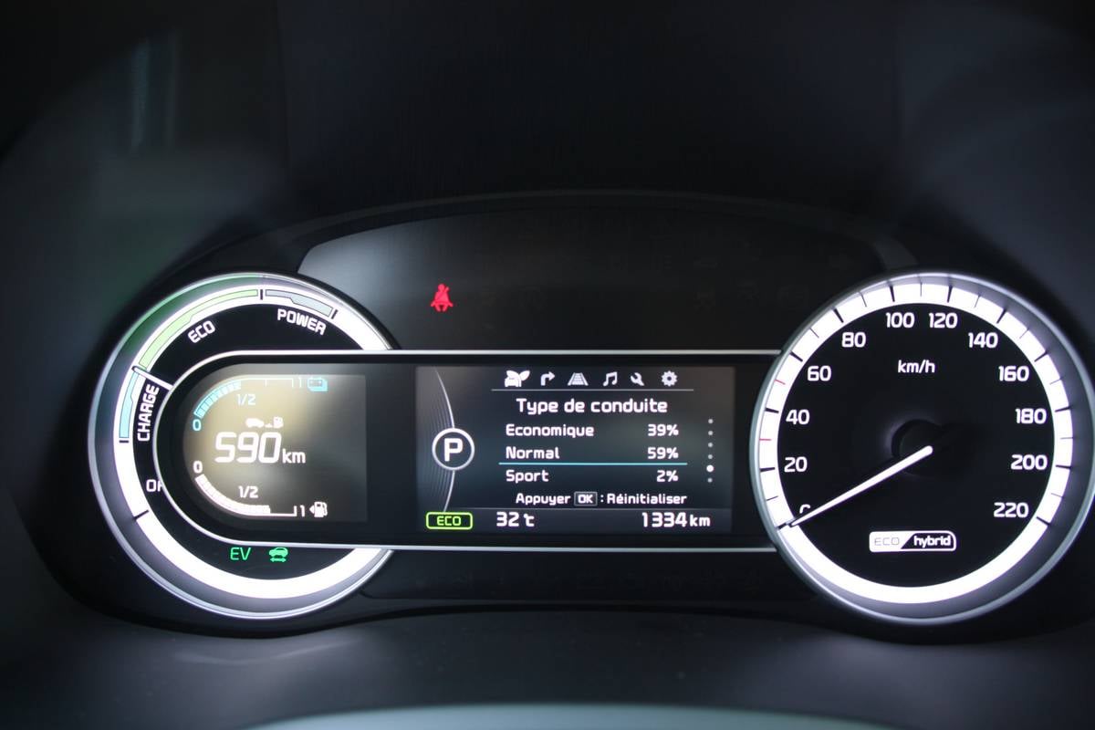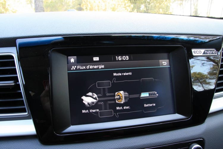 Via l’écran TFT 4.2 pouces situé derrière le volant ou l’écran tactile, l’utilisateur a accès à un ensemble d’informations spécifiques au fonctionnement hybride du Niro. On retrouve ainsi le suivi de la consommation, les flux d’énergies, la consommation réalisée ou un arbre positionnant notre niveau d’éco-conduite associé à un système de ratio faisant la part entre conduite éco, normale et sport.