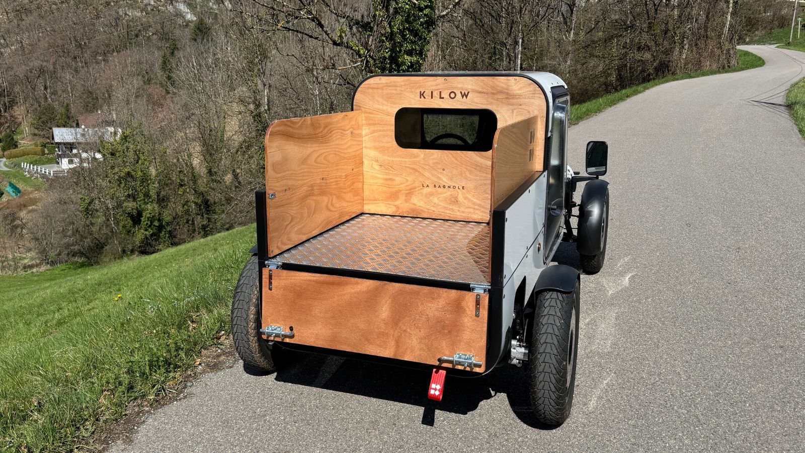 Chez Kilow, la présentation est minimaliste mais soignée, avec des matériaux bruts comme l’okoumé, un bois clair et imputrescible utilisé pour la planche de bord et les parois de la benne, ajoutant une touche rustique, et de nombreux éléments sont facturés en options, ce qui permet de personnaliser la bagnole selon ses besoins. Notre modèle d’essai de couleur blanche recevait ainsi des portes transparentes renforcées (1 290 €), un toit (490 €) et des garde-boues (490 €).