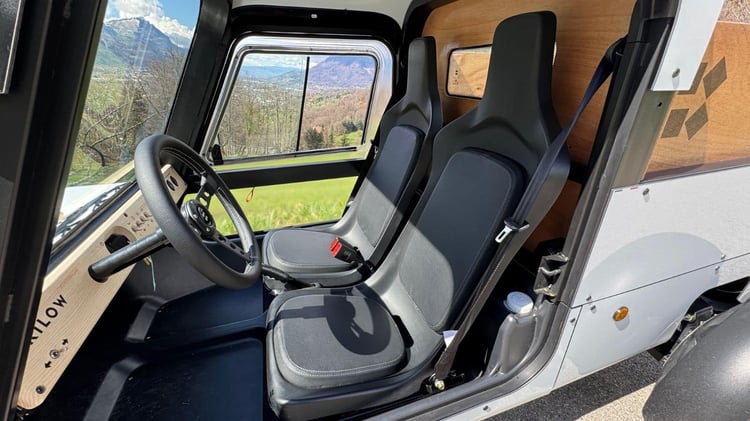 Chez Kilow, la présentation est minimaliste mais soignée, avec des matériaux bruts comme l’okoumé, un bois clair et imputrescible utilisé pour la planche de bord et les parois de la benne, ajoutant une touche rustique, et de nombreux éléments sont facturés en options, ce qui permet de personnaliser la bagnole selon ses besoins. Notre modèle d’essai de couleur blanche recevait ainsi des portes transparentes renforcées (1 290 €), un toit (490 €) et des garde-boues (490 €).