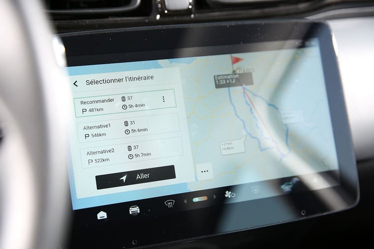 À noter que la citadine ne propose aucun planificateur d’itinéraire embarqué. À ce jour, seul Chargemap propose un simulateur pour la T03. Ce dernier se montre cependant très pessimiste, avec un trajet à quatre arrêts (dont un en dehors de l’autoroute) pour un total de 2 h 43 de recharge.