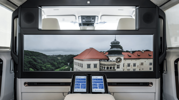 Des réunions peuvent se tenir via Zoom ou Meet sur un fantastique écran de 48 pouces, soit 122 cm. Il est compatible HDMI, USB-C ou Bluetooth et divisible en deux parties si les passagers arrière doivent conduire différentes négociations.