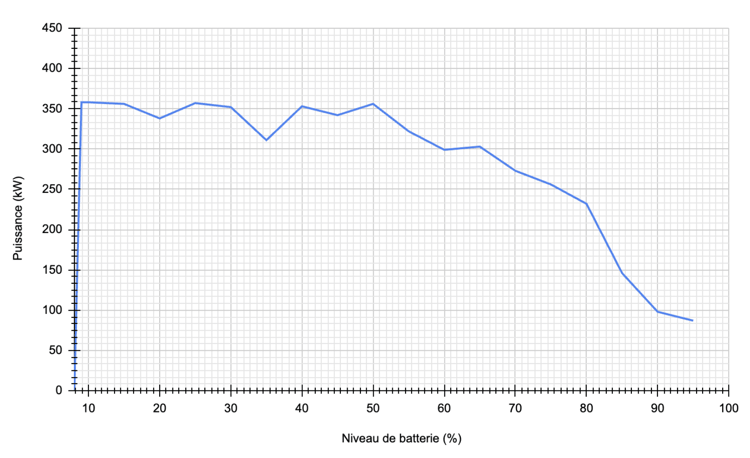 Et pourtant, après une charge qui est allée de 8 à 95 %, la moue dubitative de Mathieu s’est transformée en sourire admiratif face aux chiffres à couper le souffle que nous avons obtenus : 10 à 80 % en à peine plus de 14 minutes, pic à 360 kW, plus de 300 kW jusqu’à 60 %, plus de 200 kW à 80 % et encore 100 kW à 90 % ! Du jamais vu pour lui comme pour moi.