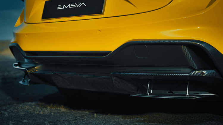 En 1981, Lotus sortait la 88, une Formule 1 si révolutionnaire par ses éléments aérodynamiques actifs qu’elle a été bannie instantanément par la FIA sans avoir effectué la moindre course. L’Emeya, elle, n’a pas à se plier à un règlement quelconque en la matière, et ça se voit. Pour commencer, elle a été soigneusement conçue en soufflerie pour que l’air passe non seulement autour mais aussi à travers sa carrosserie pour réduire la trainée et augmenter l’appui.