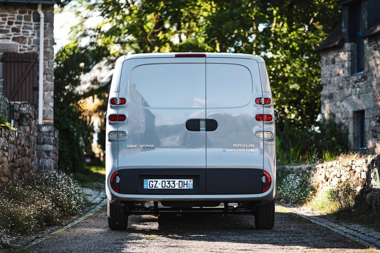 On continue vers deux portes latérales (de série), et une partie arrière un peu moins « géométrique ». Les feux arrière sont indépendants et arrondis, et les portes battantes en 2/3 et 1/3. Bien qu’il soit simple et accessible, le Maxus eDeliver5 soigne sa présentation. Assemblages et finitions sont des plus sérieux, sans oublier quelques petits détails valorisants. On pense notamment aux éléments de carrosserie noir brillant, et aux jantes.