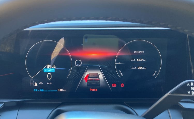 Sur cette Megane e-Tech, tout tombe à portée de main. Comme sur une Tesla Model 3, les vitesses s’activent directement grâce à une commande située derrière le volant tandis qu’un bouton facilite la sélection des différents modes de conduite. Inédit chez Renault, le réglage du frein moteur passe par un système de palettes au volant. Au niveau le plus fort, le système ne va pas jusqu’à arrêter la voiture qui continuera à évoluer à très faible allure.