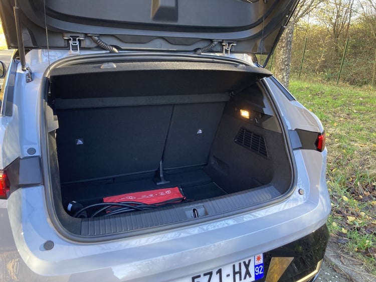 Au niveau du coffre, la Megane e-Tech propose 440 litres. Correct pour la catégorie, le volume est même largement supérieur à celui de la Volkswagen ID.3, limitée à 385 litres. Si l’espace n’est pas très pratique avec un accès qui n’est pas très large et un seuil de chargement assez haut, la Megane e-Tech profite d’un petit double fond de 22 litres. À défaut de coffre à l’avant, celui-ci permet de ranger proprement les câbles de recharge. La modularité est également au rendez-vous grâce à une banquette arrière rabattable en deux parties.