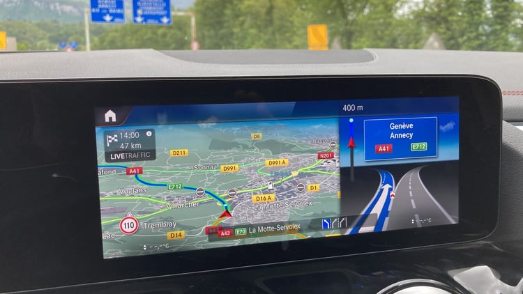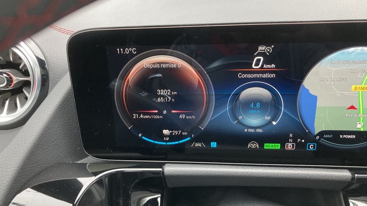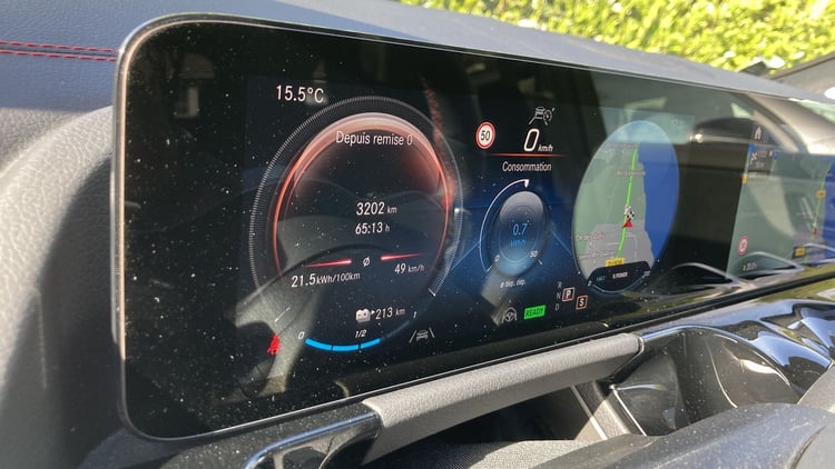 Deux écrans d’un peu plus de 10 pouces sont reliés en enfilade. Celui de gauche affiche par défaut les informations de conduite. Le multimédia avec planificateur occupe celui de droite. Cette tablette est dotée d’une navigation tactile, soit directement en passant les doigts dessus, soit en utilisant un pavé qui prend la place de l’habituel levier de vitesses.