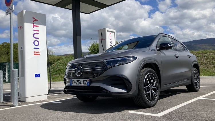 Sur une borne Ionity, il ne faut que 30 minutes pour retrouver un niveau de charge de 80 %. Le Mercedes EQA accepte des puissances DC jusqu’à 100 kW.