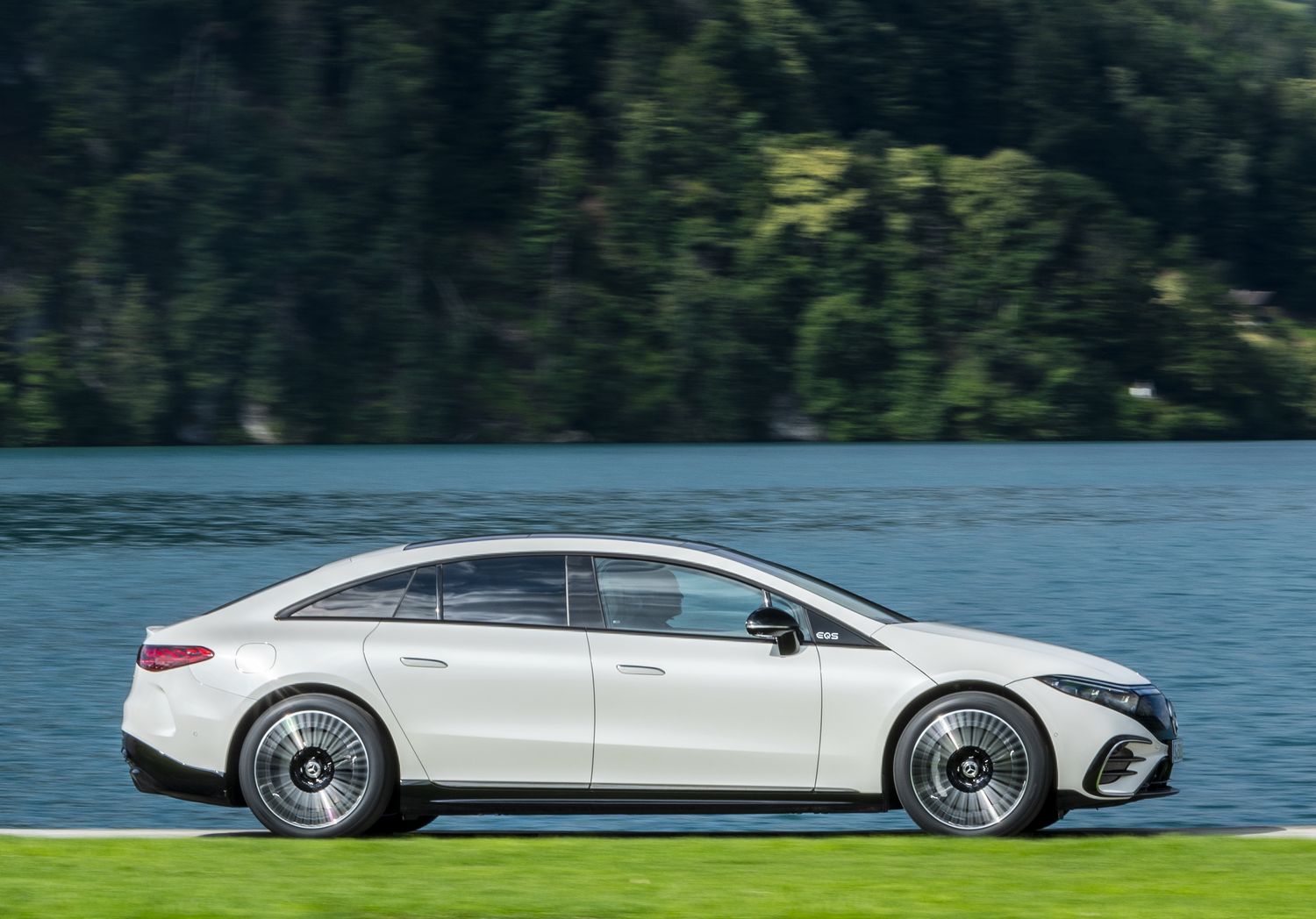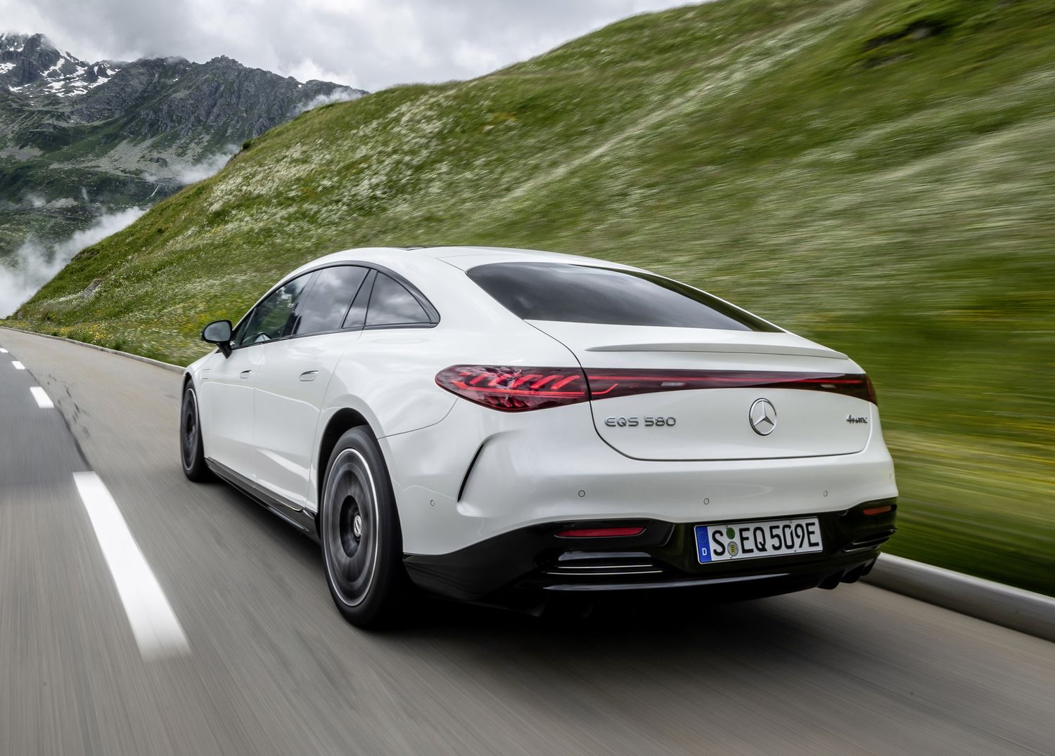 Au lancement, deux versions de l’EQS sont proposées. La première, l’EQS 450, est une simple propulsion dotée d’un unique moteur arrière de 245 kW (333 ch). Dans cette configuration, les accélérations et reprises sont évidemment confortables (0 à 100 km/h en 6,2 secondes, vitesse de pointe de 210 km/h), mais on serait en droit d’attendre plus de réactivité d’un modèle de ce standing. La masse très élevée (2 480 kg) étouffe évidemment la puissance. Mais la douceur est au rendez-vous. En aucun cas, l’EQS ne délivre un violent coup de pied aux fesses : en lissant les accélérations, c’est le confort qui est privilégié.