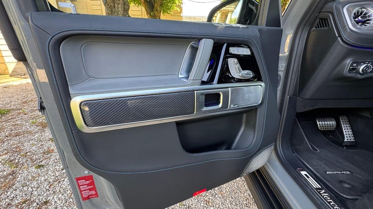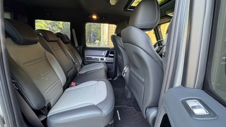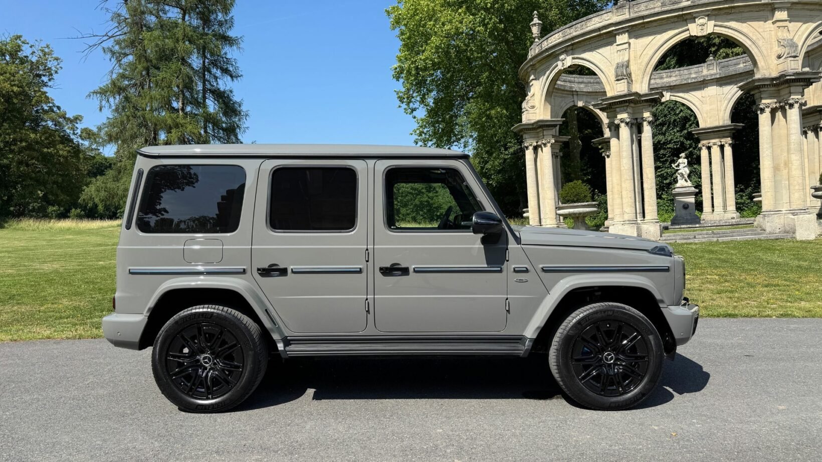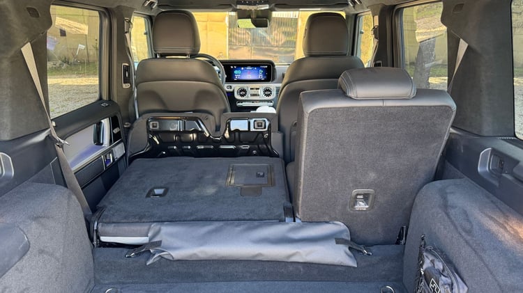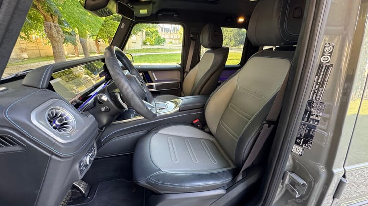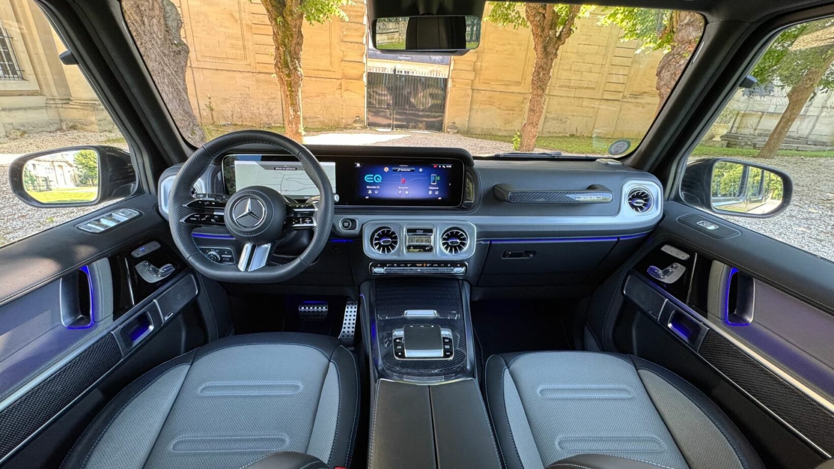 Le 0 à 100 km/h est avalé en 4,7 secondes. C’est à peine moins rapide qu’un G63 thermique, et bien plus nerveux qu’un G500. Les reprises sont bluffantes, et la direction, bien calibrée en mode Sport, rend l’engin étonnamment agile. Le Torque Vectoring fait bien son travail, même si les Michelin à flancs hauts peinent à suivre la cadence et couinent leur désapprobation dans les virages. Mention spéciale aux sièges dynamiques qui gonflent pour maintenir le corps en courbe. Mais les gabarits généreux se sentiront vite oppressés. Ce n’est pas un fauteuil club. Le freinage, malgré les 3 085 kg sur la balance (3 010 à vide), reste convaincant grâce aux gros disques et à une régénération bien dosée. Seul bémol : une pédale trop longue et spongieuse, certes utile pour éviter les à-coups en ville où en tout terrain, mais peu rassurante en conduite dynamique.