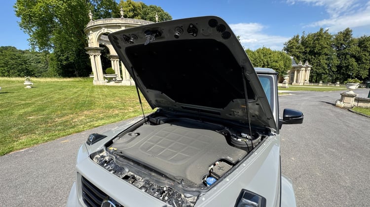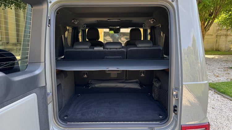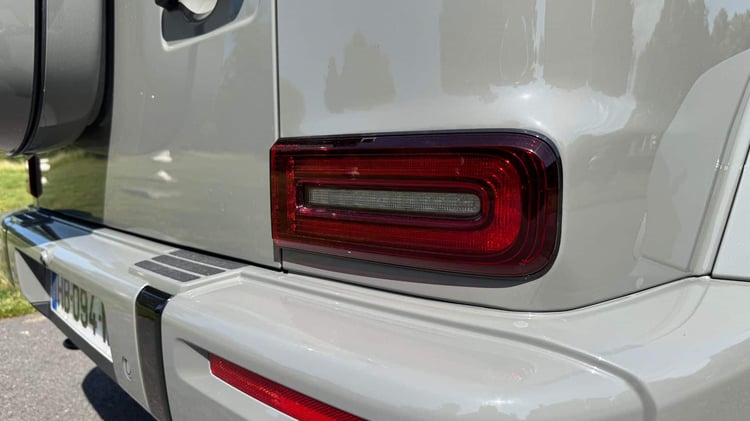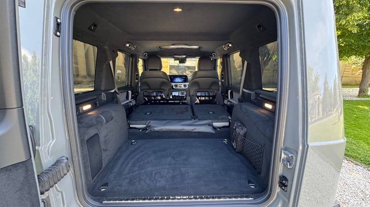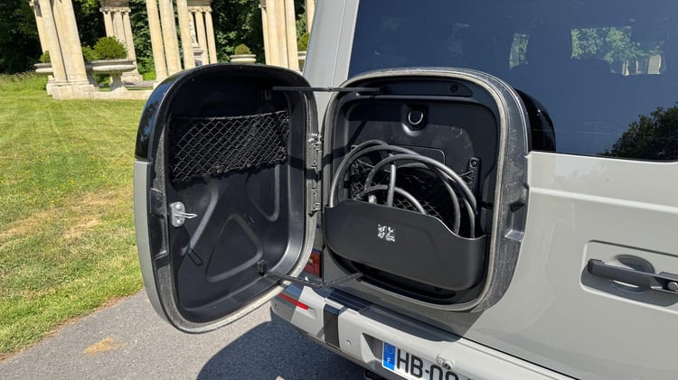 Esthétiquement, le G reste fidèle à lui-même. Il ne cherche pas à séduire par des lignes aérodynamiques, mais impose sa stature comme un boxeur poids lourd en smoking. 4,86 m de long, 1,98 m de large et 1,99 m de haut : mieux vaut vérifier la hauteur limite avant de s’engager dans un parking souterrain. Notre modèle Edition One, série de lancement haut de gamme, affichait une configuration aussi sobre qu’élégante : peinture Gris Classique Uni Manufaktur (4 700 €), jantes noires 20 pouces (450 €), vitres surteintées, toit ouvrant, marchepieds latéraux. À l’arrière, un petit coffre à câbles en plastique rigide, façon boîte à goûter premium permet de loger ses câbles. Dommage qu’on ne retrouve pas une vraie roue de secours avec un logement central.