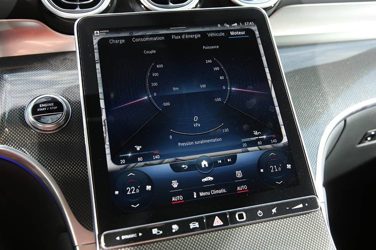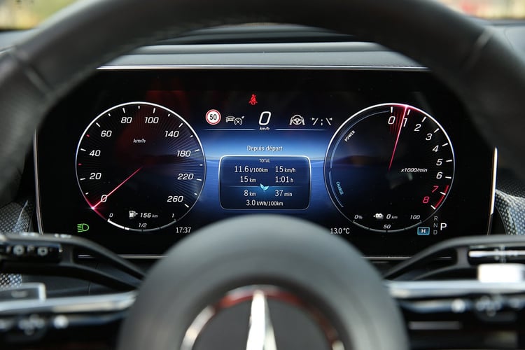 Cette gigantesque batterie peut assurer jusqu’à 126 km d’autonomie sur le cycle WLTP dans cette configuration AMG Line, voire 130 km en ville. On remarque déjà ici le faible écart entre les deux cycles, quand la procédure ville est censée donner plus d’autonomie en temps normal. On va y revenir. Dans tous les cas, voilà qui repousse d’autant plus l’utilisation du 4-cylindres 2.0 l essence de 204 ch. Celui-ci est associé à une machine électrique de 136 ch, pour un total combiné de 313 ch et 550 Nm de couple. L’ensemble est envoyé aux quatre roues via la boîte automatique 9G-Tronic. Si le mode Electric permet de filer jusqu’à 140 km/h, la fonction Hybrid peut aller chercher les 217 km/h et un 0-100 km/h en 6,7 s. Des chiffres pas si affolants finalement en raison d’une masse de 2 280 kg à vide !