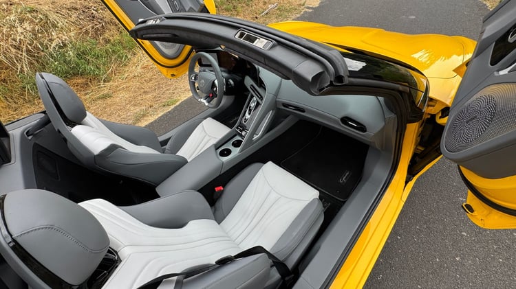 La direction manque un poil de rappel et de retour d’information, mais elle reste assez précise et douce en manœuvre. Le roulis est bien contenu, les mouvements de caisse filtrés avec soin, et les suspensions plus souples que sur la 4WD absorbent les défauts de la route avec une élégance rare sur un cabriolet. Le poids contenu à 1 885 kg (contre 1 985 kg pour la version double moteur) contribue à cette agilité. En prime, décapoté, les remous d’air sont limités grâce à un filet anti-remous bien pensé.