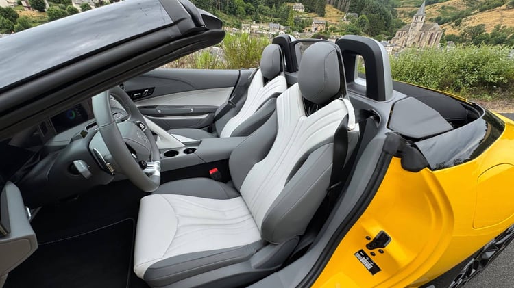 Il suffit d’un regard pour comprendre que ce MG Cyberster n’est pas là pour jouer dans la cour des SUV. Avec ses 4,54 m de long, 1,91 m de large et une hauteur de 1,33 m tout mouillé, il colle à la route comme un lézard au soleil. L’empattement de 2,69 m inspire la stabilité et son Cx de 0,27 trahit un vrai travail d’aérodynamique. Feux full LED, rétros repliables électriquement, freinage Brembo quatre pistons à l’avant, portes sans montant… Le Cyberster coche toutes les cases du véhicule sportif en conservant un certain flegme britannique. Le toit souple, commandé électriquement, se replie en dix secondes jusqu’à 50 km/h. Parfait pour passer en mode cheveux au vent (ou crâne au vent) à la moindre éclaircie.