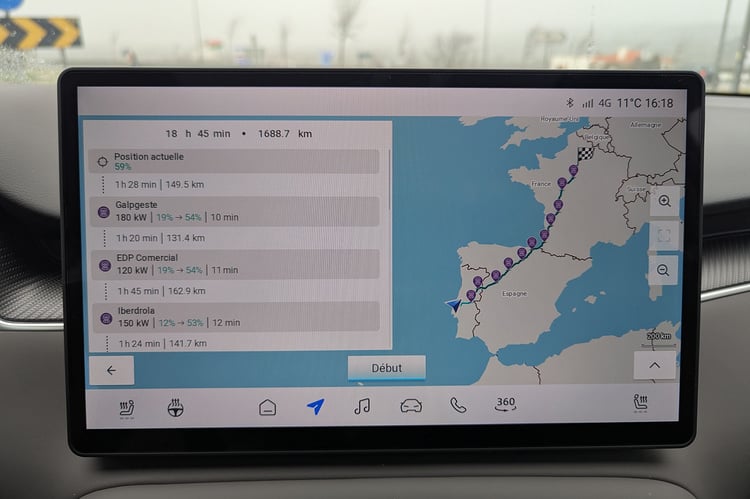 À noter que le planificateur d’itinéraire, assez complet avec une indication sur le taux de charge restant aux étapes ou à l’arrivée, ne s’est pas montré convaincant. Au très long temps de calcul s’ajoute une prédiction étonnante du parcours : le système n’a pas toujours respecté notre demande d’un taux minimal de 10 % aux bornes, mais surtout, toutes les recharges prévues ne devaient durer qu’une dizaine de minutes, sans dépasser les 55 %. Bilan : 11 arrêts prévus pour parcourir les près de 1 690 km entre le nord de Lisbonne et Paris.