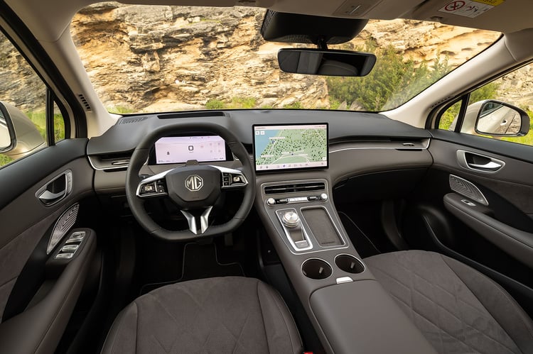 À bord, il n’a évidemment plus rien à voir avec son prédécesseur. Le MG S6 EV reprend les codes stylistiques intérieurs des derniers modèles de la marque, dont son petit frère le MG S5 EV. La présentation est certes plus classique, mais elle est nettement plus convaincante. Ce dessin épuré s’accompagne aussi d’une finition assez plaisante : panneaux rembourrés, inserts décoratifs sobres, revêtement façon Alcantara sur le chargeur à induction, cerclage façon alu… Les matériaux participent à la qualité perçue.