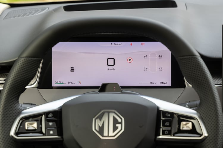 La pédale de frein by-wire offre un ressenti naturel, une décélération très convaincante et une excellente endurance, notamment en conduite en montagne. En milieu urbain, les conducteurs privilégieront davantage le freinage régénératif. À ces différents niveaux de décélération s’ajoute un mode One-Pedal, à la fois puissant et progressif jusqu’à l’arrêt complet du véhicule. Toutefois, pour accéder à ces fonctionnalités, il faut soit utiliser un bouton sur le volant, soit passer par l’écran tactile. Des palettes au volant, comme sur le Cyberster, auraient été bien plus pratiques.